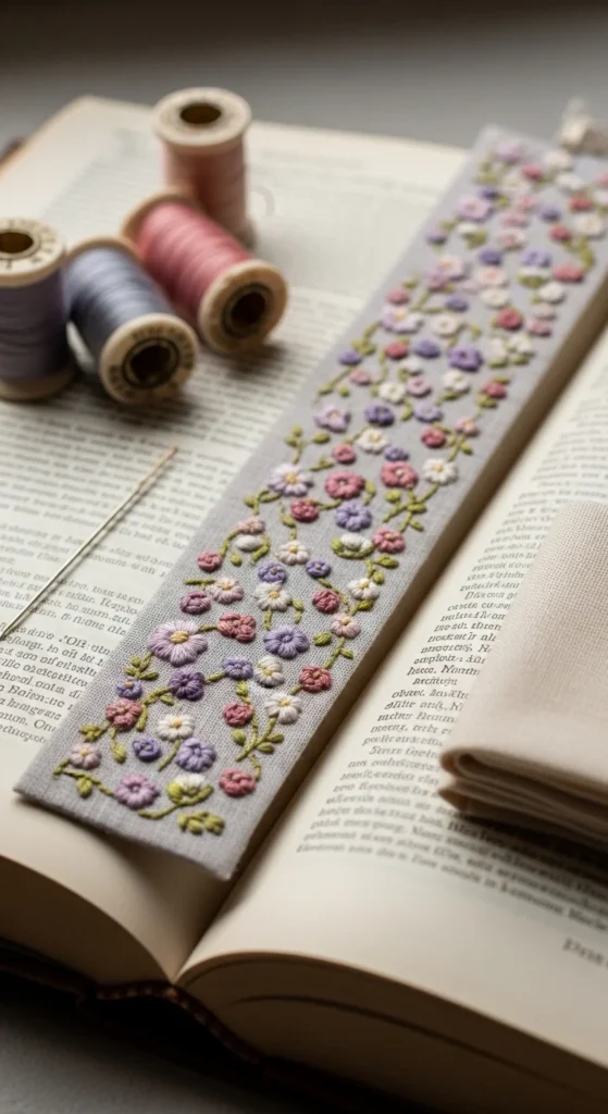 The stitched design does not need to be fancy. Tiny flowers, little hearts, stars, or a simple leaf pattern are enough. Even beginner stitches can look charming on a bookmark because the project is so small. This is a good way to use leftover embroidery floss and fabric scraps from old sewing projects.