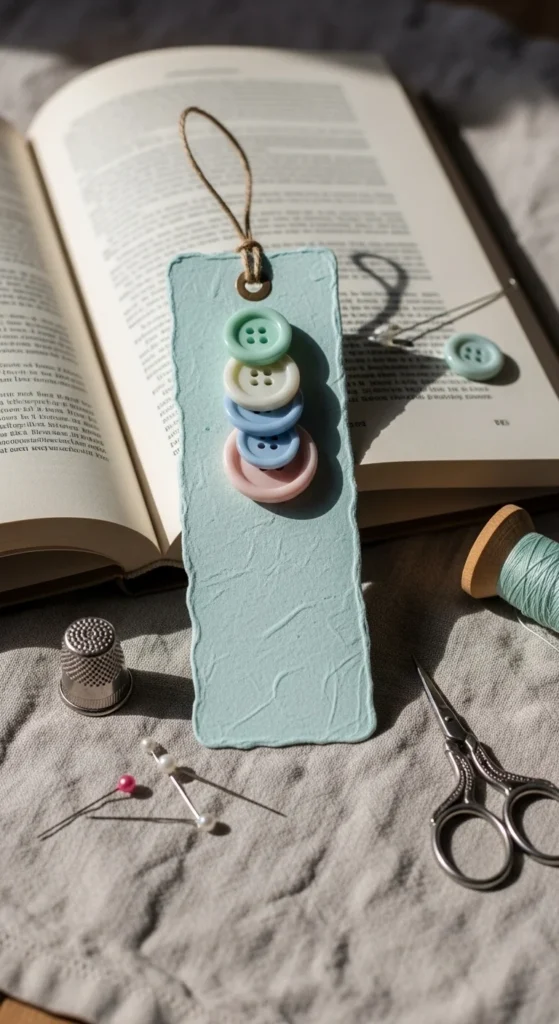 A button stack bookmark is a fun way to use spare buttons from sewing tins, old shirts, or thrifted craft bags. The bookmark base can be ribbon, elastic cord, or cardstock, with a few buttons stacked and stitched or glued near the top. The result feels handmade and slightly vintage without much work.