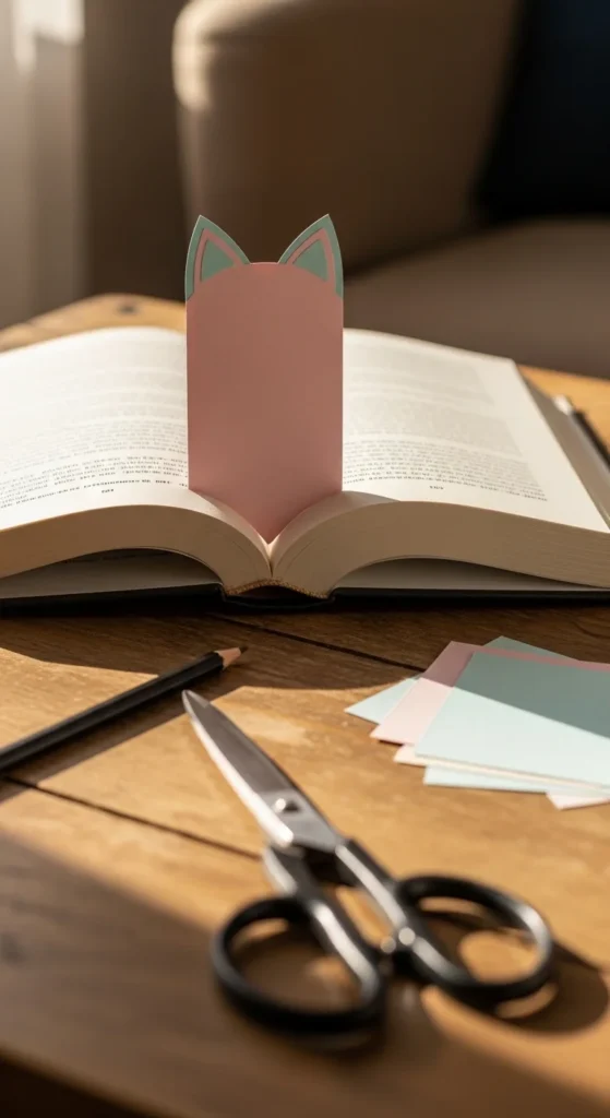 A cat ears peekaboo bookmark is perfect for readers who love playful designs. The top of the bookmark sticks out of the book, and the little ears make it look like a tiny cat is hiding inside your pages. You can make this from cardstock, felt, or even thin foam sheets. Draw a simple cat head shape with two pointed ears, then attach it to a long bookmark strip.