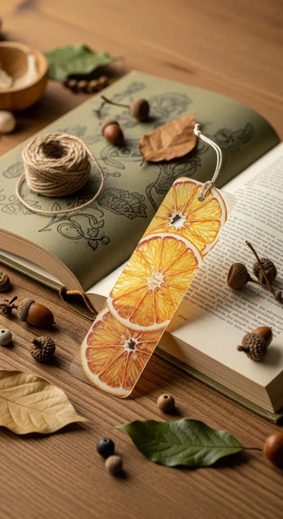 A dried citrus slice bookmark has a bright handmade look that feels sunny and cheerful. Since real dried fruit can become fragile, the easiest version is to make citrus slice shapes from paper, cardstock, or thin foam, then seal them with clear laminate or contact paper. Orange, lemon, and grapefruit colors all work beautifully.