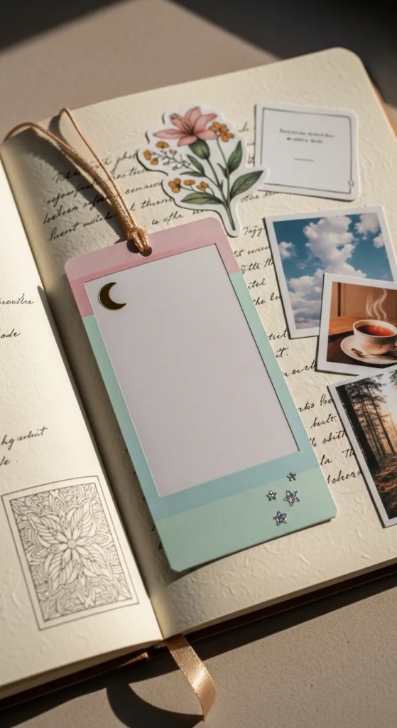 A Polaroid-style memory bookmark gives your craft a scrapbook look while still staying practical. Cut cardstock into a long strip, then add a small white photo-frame shape near the top so it looks like a mini instant photo. Inside the frame, you can place a tiny drawing, patterned paper, fabric scrap, or a pressed leaf.