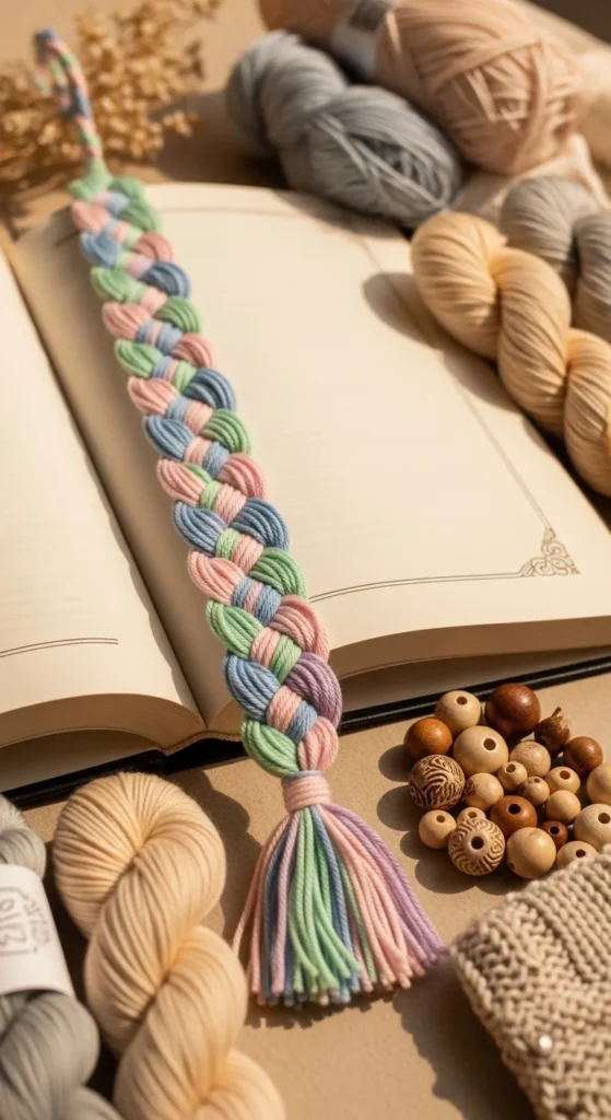 This style feels cozy and handmade, especially in soft pink, cream, sage, or lavender shades. Thicker yarn gives a chunkier look, while embroidery floss or thinner yarn makes the braid more delicate. It is one of the easiest bookmarks to make in groups, so it is nice for craft afternoons, book club gifts, or classroom projects.