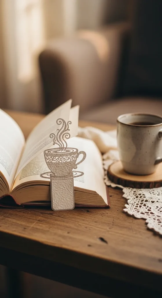 A tea cup bookmark is a charming choice for readers who love cozy details. The top can be shaped like a tiny cup and saucer, while the bookmark strip hangs down like the rest of the design. A curled paper detail or painted line above the cup can look like steam rising, which adds a soft whimsical touch.