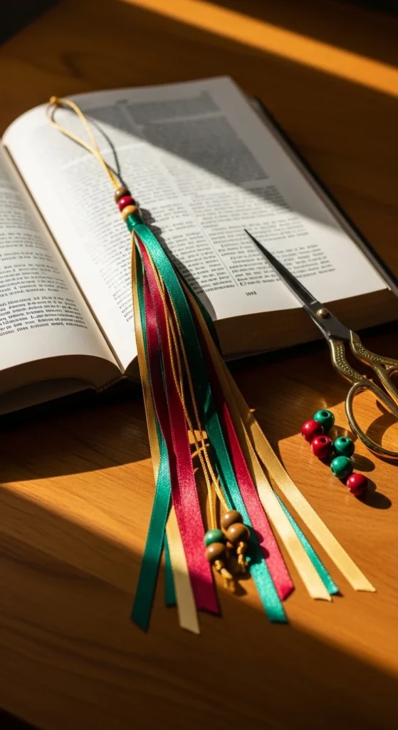 A ribbon tassel bookmark feels soft, light, and classic. It works well if you want something simple but still pretty enough to gift. All you need is ribbon, thread, and a little time. You can cut several strands of ribbon in matching shades, fold them in half, tie them at the top, and trim the ends neatly. Add a bead or charm near the top for extra detail.