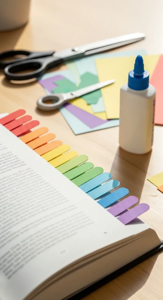 A rainbow tab bookmark is bright, useful, and a great choice if you like a mix of decoration and function. Instead of one long strip, this style can include layered tabs in several colors along the top or side of the bookmark. When placed in a book, the colors peek out and make it easy to spot your place quickly.
