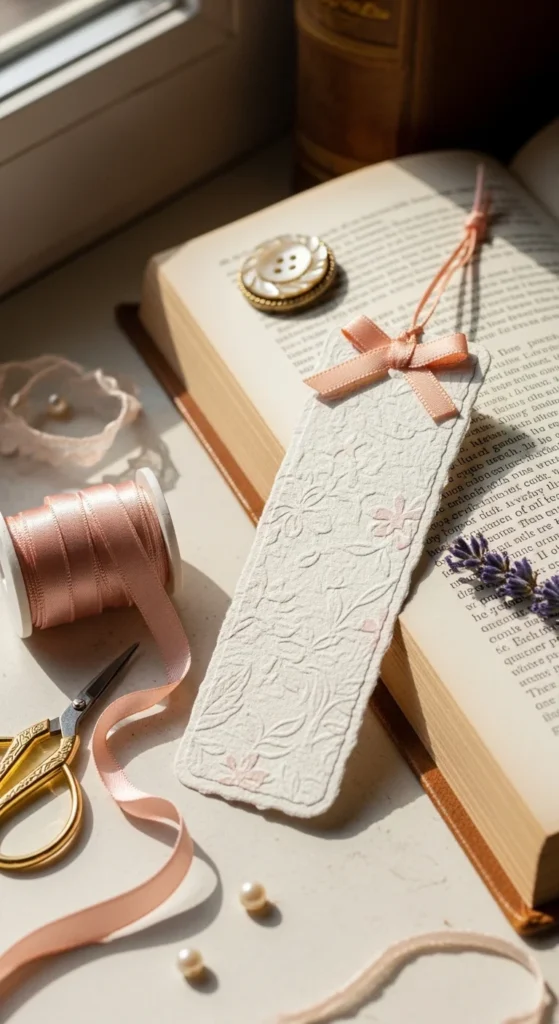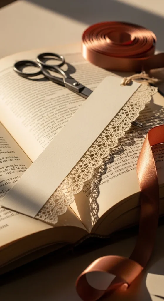 This bookmark has a handmade vintage mood without requiring hard sewing work. It is a good choice for gifts because it looks special with very little effort. Pair it with a secondhand classic or wrap a few in tissue paper for a reading-themed present. Even one small piece of lace can turn a plain bookmark into something that feels delicate, soft, and full of charm.
