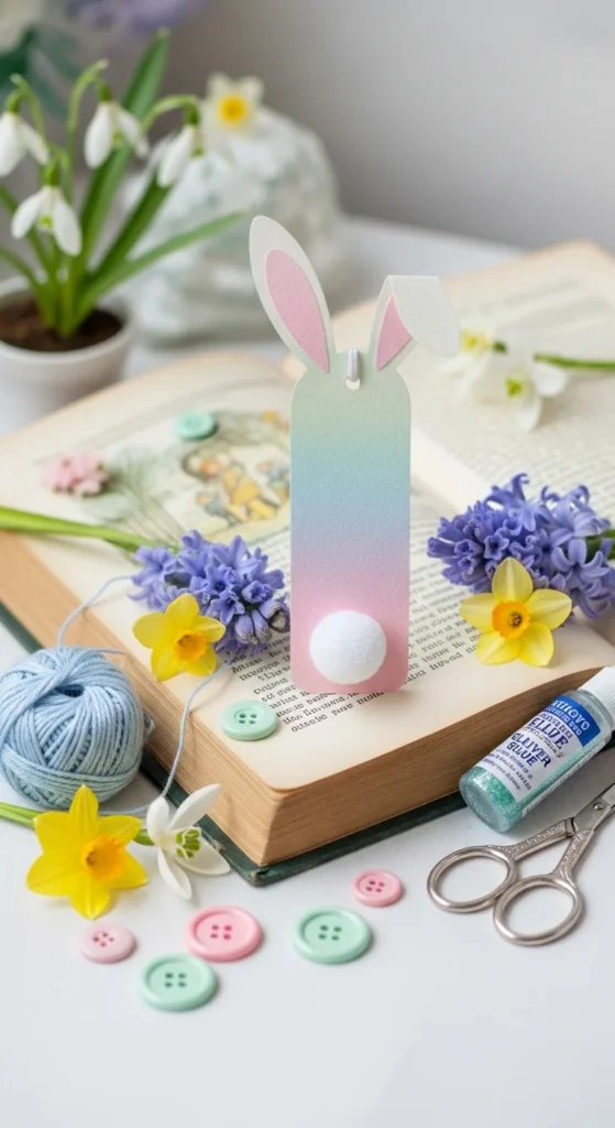 White, blush, beige, and pale gray are great colors for this craft. You can add tiny inner ear details with pink paper or marker. If you want the bookmark flatter, skip the pom-pom and use a paper circle instead. That still keeps the bunny look while making storage easier.