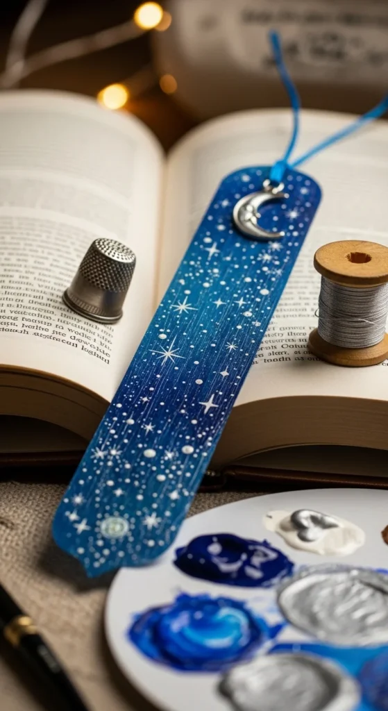 A starry night bookmark is a beautiful way to bring a dreamy sky theme into your reading routine. Paint a strip of thick paper in deep blue, indigo, or muted purple, then add tiny stars with white or metallic paint. A crescent moon charm or silver bead tied at the top gives it a little more detail without making it too hard to use.