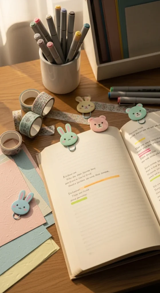 A kawaii animal paper clip bookmark is small, playful, and quick to make. It is great if you want a bookmark that does not take much space and can be used in planners, notebooks, or chapter books. Start with jumbo paper clips and glue small animal faces onto the top using cardstock, foam sheets, or felt. Bears, bunnies, cats, and frogs all work well.