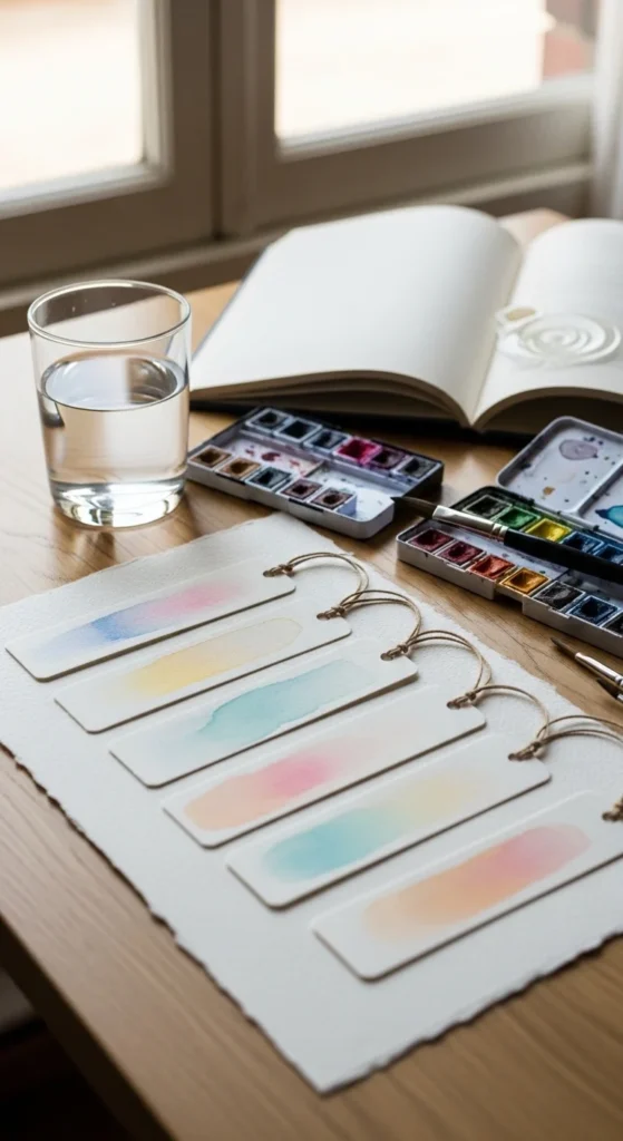 A watercolor wash bookmark is perfect for readers who like soft color and simple crafts. It looks artistic, but the steps are very easy. Cut sturdy paper into bookmark strips, then paint each one with a loose wash of color. Try pale pink, sky blue, lavender, peach, or sage for a calm look. Let the paint move naturally across the paper instead of trying to control every little mark.