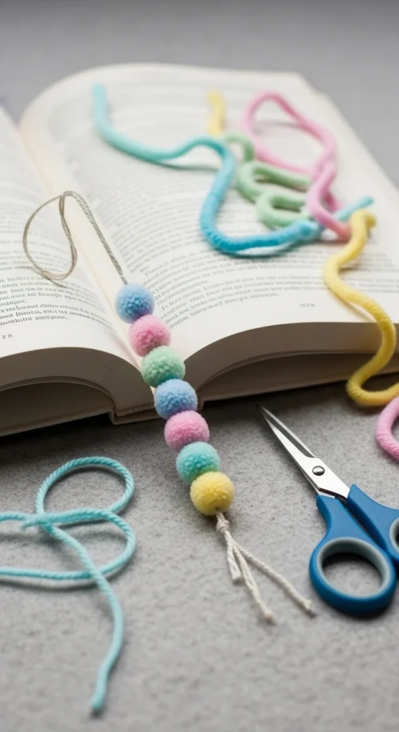 A mini pom-pom bookmark adds texture and color in a very playful way. It is a good pick if you enjoy yarn crafts or want to use leftover bits from knitting or crochet. You can make a slim bookmark from cardstock, then glue one or several tiny pom-poms along the top edge. Another option is to tie a pom-pom onto a ribbon bookmark so it peeks out of the book.