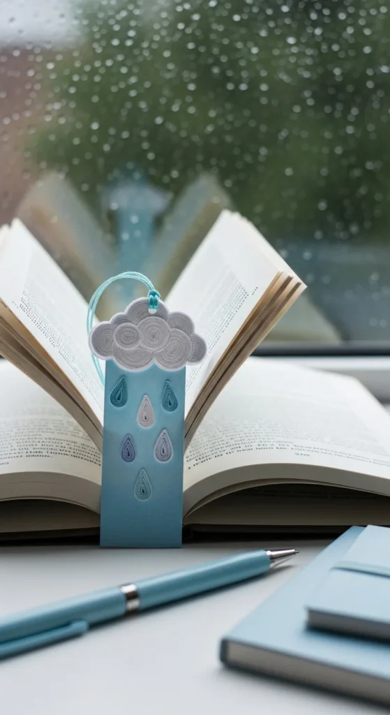 A cloud and raindrop bookmark has a calm, dreamy style that works well for readers who like soft colors and playful details. The top of the bookmark can be a white or pale gray cloud, while thin strings or thread hold little blue paper raindrops underneath. When the bookmark hangs out of the book, the drops add movement and charm.