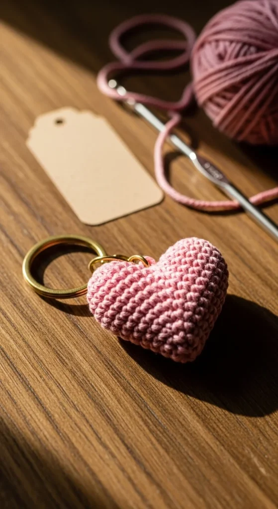 These tiny hearts are quick, cute, and perfect when you want a small gift that still feels personal. Use leftover yarn and make a few in different colors so you always have one ready. For a clean look, pick a tight stitch and stuff it lightly so it holds shape without looking lumpy. Add a key ring, lobster clasp, or even a ribbon loop. You can also swap the heart for a star or flower using the same idea. If you’re gifting it, tuck it into a small envelope with a tea bag or candy. For decor, hang a few hearts from a doorknob or a wall hook. Keep it budget-friendly by using scraps from bigger projects and a basic metal key ring pack. If you want it to feel extra special, use one pop color and one neutral, like cream and rose. Small size, big “aww” factor.