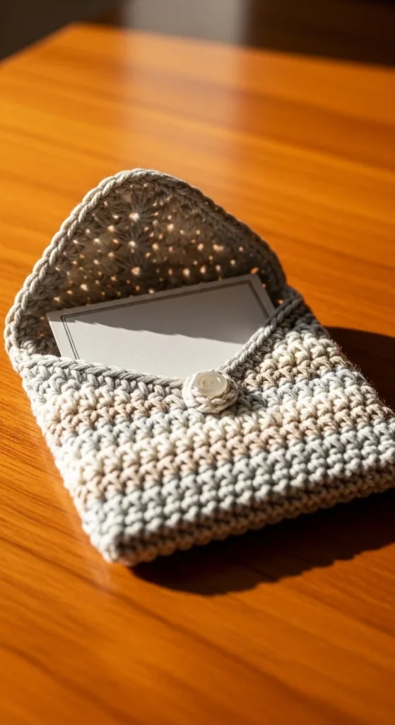 If you’re giving cash or a gift card, a crochet envelope makes it feel handmade. Crochet a small rectangle, fold it into an envelope shape, and stitch the sides. Add a button flap, snap, or simple tie. It’s also reusable, which people love. Choose a solid color to keep it clean, or use stripes for a fun look. For gifting, tuck in a small note card (blank) and the gift card. For decor, these can also hold hair clips, earrings, or tiny notes in a drawer. Budget tip: this is a great scrap project because it’s small and flat. Make a few so you always have one ready for birthdays. Turns “money gift” into something warm and personal.