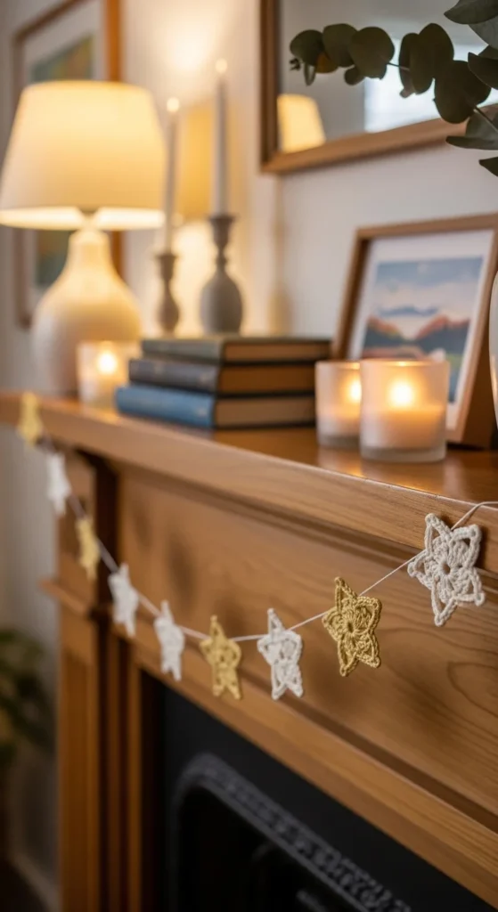 Star garlands work for holidays, nurseries, and cozy room decor year-round. Crochet small stars, then string them on yarn or twine. Keep spacing even so it looks tidy. For a soft vibe, use cream, pale yellow, and light gray. For a fun kids’ room, go bright with rainbow colors. Hang it above a bed, across a shelf, or along a window frame. Budget tip: garlands are perfect for using leftovers because each star uses a small amount of yarn. If you want it to look polished, block the stars lightly so they lay flat. You can also add tiny wooden beads between stars for extra texture. For gifting, wrap the garland around a small piece of cardboard so it looks neat in the package. Instant cozy decor without spending much.