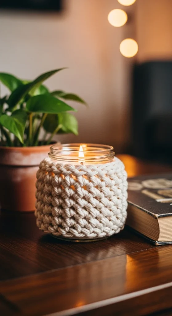 A candle wrap turns a plain jar candle into a cute decor piece. Crochet a sleeve that fits snugly around the jar and add a simple stitch texture so it looks rich without being complicated. Keep the top edge below the candle rim so it stays safe and clean-looking. Neutral tones work well, but you can also match seasonal decor with rust, sage, or navy. For gifts, wrap it around a new candle and tie a ribbon around the jar. For decor, keep one on a tray with a small plant and a coaster for a styled look. Budget tip: you can thrift plain jar candles or buy budget candles and make them look special with the crochet sleeve. A small upgrade that looks cozy on any shelf.
