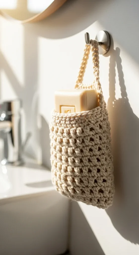 Soap saver pouches are cute and useful, especially for people who use bar soap. Crochet a small pouch with a drawstring or loop, and slide the soap inside. The texture helps the soap lather, and it keeps soap from slipping around the sink. Cotton yarn works great here. For gifting, pair the pouch with a handmade soap bar. For decor, hang it on a hook near the sink or in the shower area. Budget tip: these use very little yarn, and you can make a few from one skein. Keep the stitches even and make the pouch just slightly bigger than the soap so it fits well. Simple project that feels like a spa gift.
