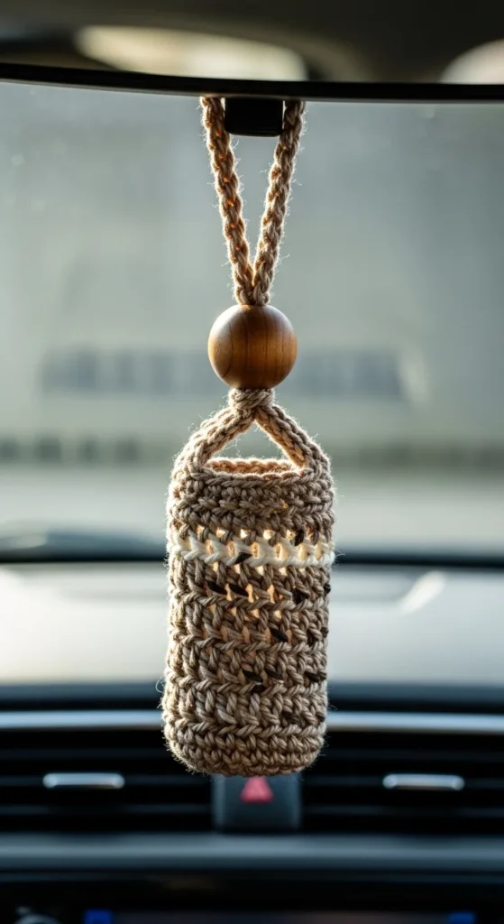 This is a cute idea for cars, closets, or small spaces. Crochet a small pouch that can hold a felt pad or a tiny sachet. Add a loop for hanging and a bead for a simple decorative detail. For a car, keep it small and lightweight so it doesn’t swing too much. For gifts, include a small felt circle that the person can add a drop of essential oil to. For decor, hang it on a closet rod or a bathroom hook. Budget tip: use cotton yarn and scraps, and keep the shape simple. If you want it to look neat, use a tight stitch and shape it like a tiny pouch with a clean top edge. Cute, practical, and a fun gift idea people don’t expect.
