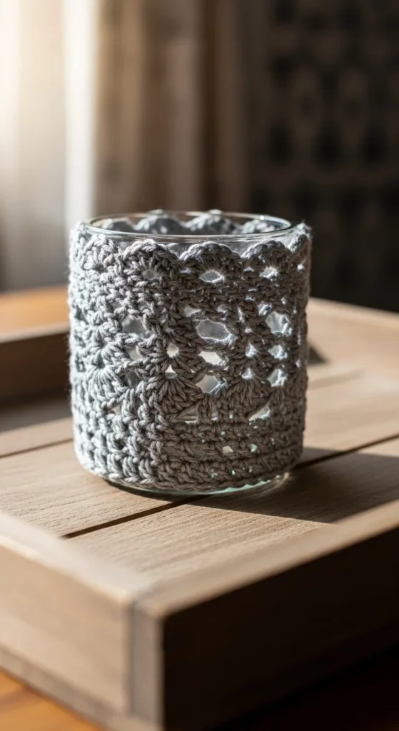Tealight sleeves are cute for table decor and quick gifts. Crochet a small wrap that fits around a glass tealight holder. Keep it snug and below the rim. Pick a yarn color that matches the room—cream, gray, or muted tones work well. For gifting, pair two holders with a pack of tealights. For decor, group three on a tray with a small plant for a cozy setup. Budget tip: thrift glass holders or reuse ones you already have, then make the crochet wrap look new. Keep stitches even and ends tucked in so it looks clean. Fast decor that makes a space feel warm.
