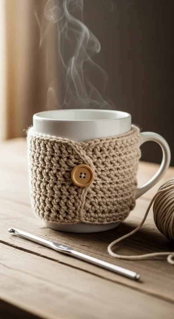 A mug cozy is one of the easiest “use it every day” gifts. It also makes plain mugs look cute on a desk or coffee bar. Choose a yarn that feels soft in the hand and won’t itch. Work a simple rectangle, then add a strap that wraps around and buttons closed. Wooden buttons make it look warm and handmade, while a solid color keeps it clean. For a friend, match their vibe: neutral tones for minimal style, bright stripes for a playful person. If you’re selling or gifting sets, pair the cozy with a packet of hot chocolate or instant coffee. For decor, make a few and stack them in a small basket next to your mugs. Budget tip: one skein can usually make several cozies, especially if you keep the stitch tight and the design simple. It’s cute, practical, and fast to finish.