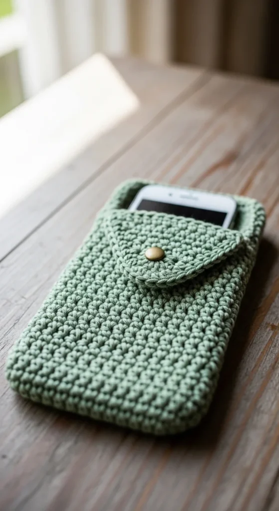 A phone pouch is a practical gift that still feels cute. Crochet a simple rectangle pouch sized to the phone, add a flap or drawstring, and attach a strap if you want it wearable. It’s great for quick errands or keeping a phone safe in a bag. Choose a sturdy yarn so it doesn’t stretch too much. For gifting, match the color to the person’s usual style black, tan, or a soft pastel. For decor, it’s also handy as a bedside phone holder. Budget tip: keep it simple with one color and a basic stitch. You can add a small button closure to make it look finished. Useful, cute, and not hard to size.