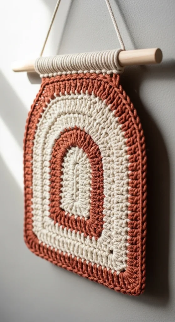 A mini wall hanging adds texture without taking up much space. Crochet an arch shape or a simple panel, then add fringe or tassels at the bottom. Attach it to a small dowel, a stick from outside, or even a metal ring. Keep colors earthy for a modern look—cream, tan, rust, and muted green work well. For gifting, this is great for housewarmings because it’s decor people can actually use. For decor, hang it above a desk, in a hallway, or next to a mirror for balance. Budget tip: keep it small and use budget yarn. If you want it to look clean, keep fringe even and trim it neatly. Soft decor that makes a wall feel finished.