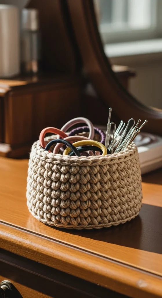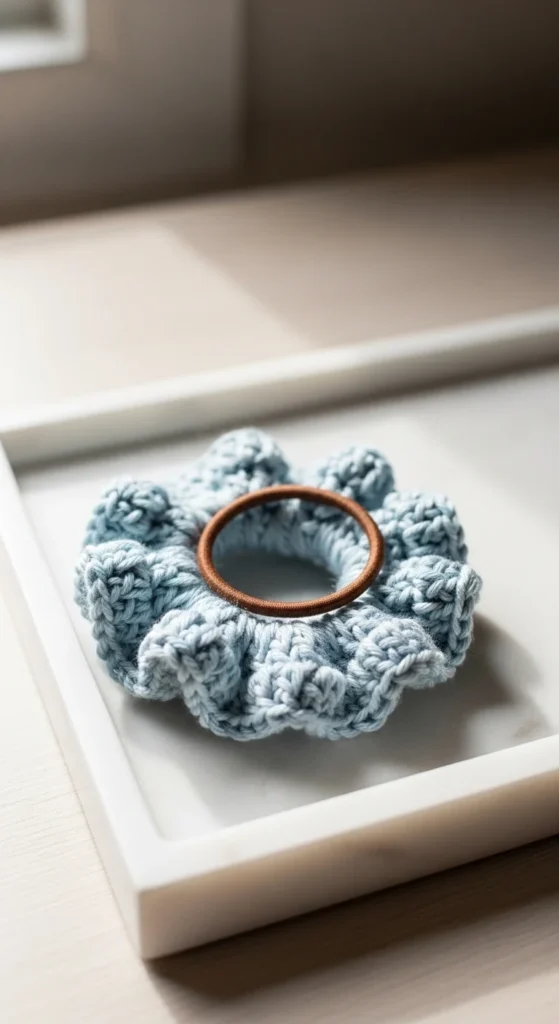 Scrunchies are cute, quick, and perfect for gifts. Crochet around a hair elastic so it gathers naturally. Use a soft yarn that won’t snag hair. For a clean look, keep stitches consistent and avoid bulky yarn unless you want a big fluffy scrunchie. These are great as stocking stuffers, party favors, or little extras in a gift bag. For decor, keep a few in a small bowl on a dresser. Budget tip: scrunchies use small amounts of yarn, and you can make multiple from leftovers. If you want a matching set, make one scrunchie and one bow clip in the same color. Fast project that people actually wear.