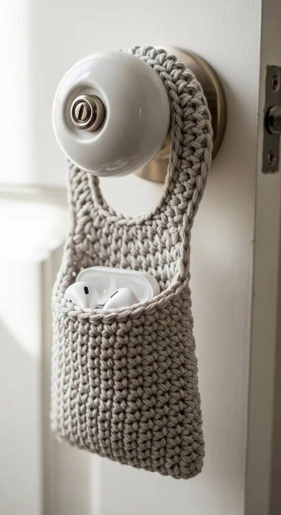 A door knob pocket is a cute little organizer for small stuff—earbuds, hair ties, or spare keys. Crochet a strip that wraps around the knob and add a small pocket at the bottom. Keep the pocket shallow so it doesn’t sag. For gifts, this is fun for teens, dorm rooms, or anyone who likes tiny organizers. For decor, choose a neutral yarn so it blends with the door and looks tidy. Budget tip: small pockets take little yarn, and the shape is basically a rectangle plus a pouch. If you want it to look polished, add a clean border stitch around the edges. A simple organizer that solves daily clutter.