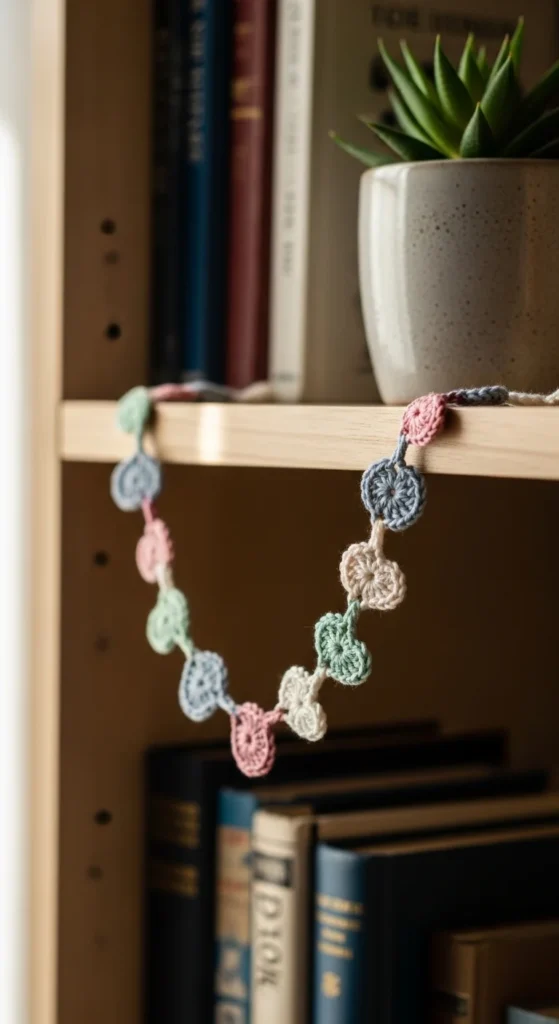 Shelf garlands are cute because they add texture without taking up space. Crochet tiny shapes like circles, hearts, or little flowers, then string them on yarn. Keep the garland short so it works for shelves, mirrors, or small corners. Pick colors that match your room or the person you’re gifting it to. For a clean look, stick to two or three colors. For decor, drape it across a bookshelf, around a small framed photo, or across a peg rail. Budget tip: garlands are scrap-friendly and easy to batch while watching a show. If you want it to look tidy, keep spacing even and tie small knots between shapes. A simple way to make a room feel cozy fast.