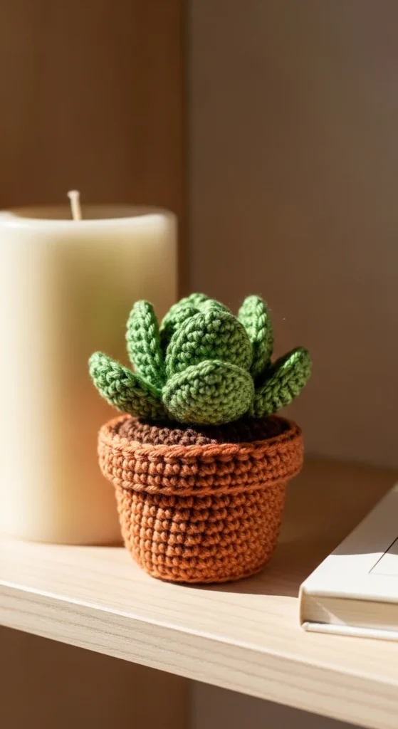 A crochet succulent is perfect for people who forget real plants. It’s also a cute shelf filler for dorms, desks, or small apartments. Make a little pot, add a bit of stuffing, and crochet simple leaf shapes that sit upright. You can glue the leaves in place or stitch them down so it stays sturdy. Use earthy colors for a realistic look, or go playful with mint green and blush. For gift-giving, this is great for coworkers because it’s small and easy to wrap. For decor, line up three mini pots on a window ledge like a tiny plant row. Budget tip: use yarn scraps for the leaves and a small amount of brown yarn for the pot. If you want it to look polished, keep the pot shape firm and the leaves evenly spaced. Cute decor with zero watering.
