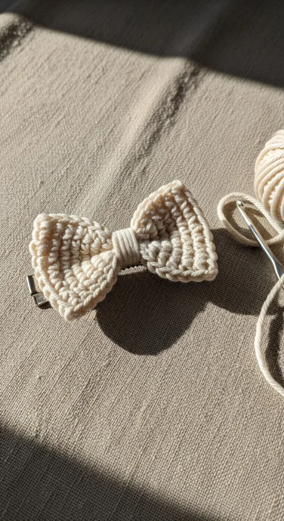 Crochet bows are small, sweet, and easy to customize. Make the bow shape first, pinch the center, and wrap yarn around the middle to form the bow knot. Attach it to a snap clip, barrette, or headband using a few strong stitches or a small dab of fabric glue. For kids, use bright colors or a pastel rainbow. For adults, keep it simple with cream, black, or dusty pink. You can also make mini bows and cluster them on a hair comb for a dressed-up look. Budget tip: bows are great scrap-busters, so you can use leftover yarn from other projects. For gifting, pair a bow clip with a matching scrunchie or a small pouch. If you want it to stay neat, choose a yarn that isn’t too fuzzy so the edges look crisp. Tiny project, instant cute.