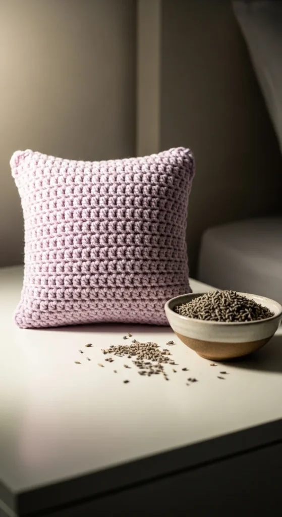 A crochet sachet pillow feels thoughtful without costing much. Crochet two small squares, stitch them together, and fill with dried lavender (or a mix of lavender and rice for a little weight). It’s great for drawers, closets, or under a pillow. Choose a tighter stitch so the filling stays inside and doesn’t poke out. If you want it extra cute, add a scalloped edge or a tiny loop for hanging. For gifts, make two and tie them together with ribbon. For decor, keep one in a basket on a dresser to add a soft “homey” touch. Budget tip: dried lavender can be bought in small bags, and each sachet only uses a little. If you don’t have lavender, use cedar chips for a similar idea. Small, calming, and easy to make in one sitting.