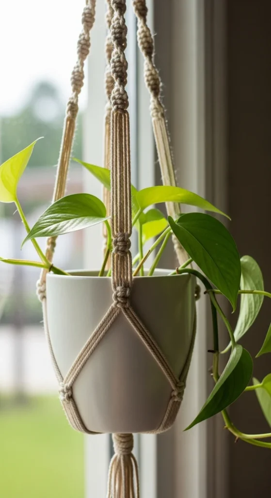 A mini plant hanger is perfect for small pots and makes a room feel cozy fast. Use a simple knot-style crochet design and keep the hanger length short so it works in small spaces. Neutral yarn like cream or tan blends with most decor, but a muted green or terracotta can match plant colors nicely. If you want it to feel gift-ready, pair it with a small plant or a faux plant. For decor, hang two at different heights near a window for a layered look. Budget tip: this project can be made with inexpensive cotton yarn, and it doesn’t take much yardage. Use sturdy stitches and secure knots so it holds weight. A small decor piece that looks like boutique home style.