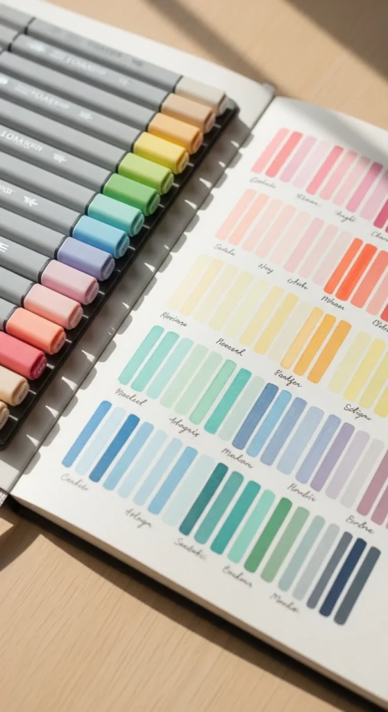 Using a soft pastel color palette can instantly make your journal look calm and coordinated. Pick three to five gentle shades and repeat them across the page. Use them for titles, lines, highlights, and small doodles. This keeps everything looking cute without feeling crowded. Try swatching your colors in a corner before writing so you know how they work together. Even simple lists feel more special with color. Budget tip: colored pencils work just as well as markers. Repeating the same palette for several pages creates a theme. Flipping through later will feel visually satisfying. The soft tones also make long writing sessions feel more relaxed.