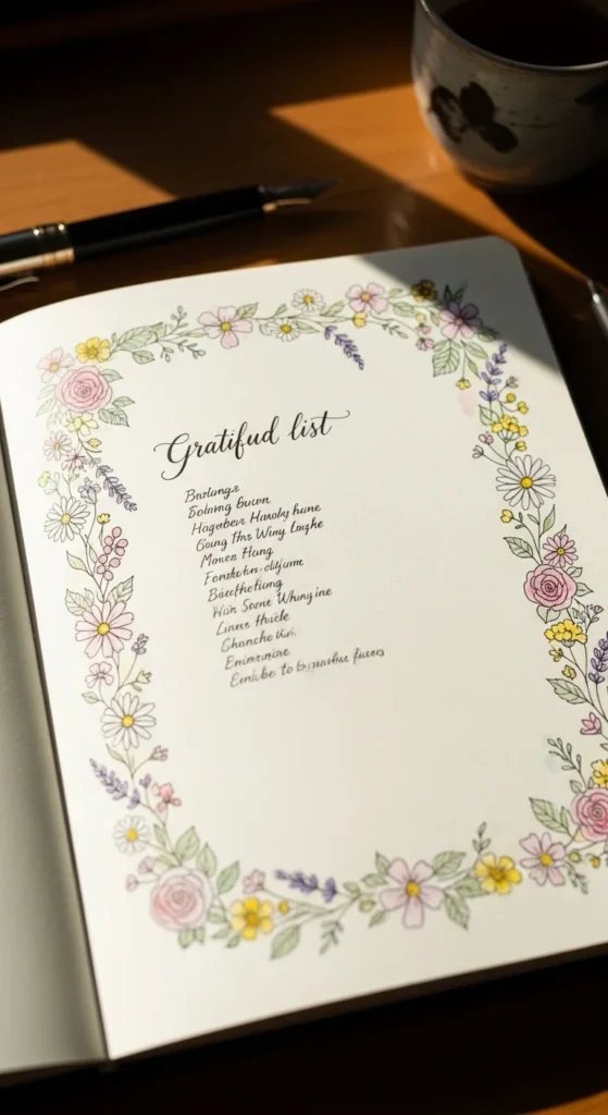 A gratitude page becomes much more inviting when it looks cheerful and decorative. Start by writing three things you’re thankful for in the center of the page. Around the words, draw small flowers, leaves, or sparkles to create a soft border. Use gentle colors like peach, light pink, or lavender for a warm feeling. You don’t need detailed art skills — simple petal shapes work beautifully. This layout helps positive thoughts stand out visually. Over time, flipping back through these pages can feel comforting. You can also change the flower style with the seasons for variety. Keeping the design light and open makes writing feel less heavy and more joyful.
