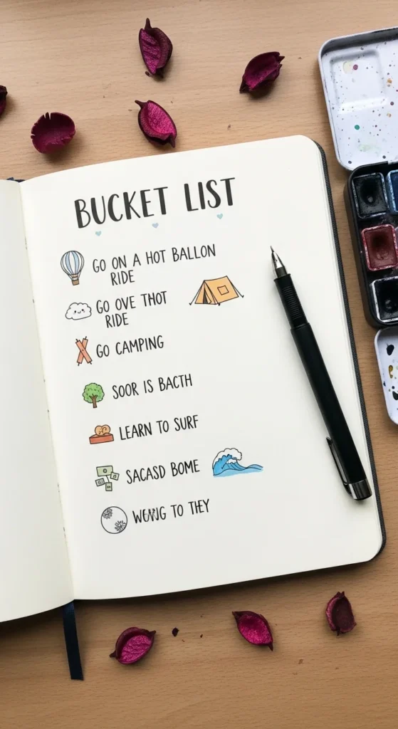 A bucket list page becomes extra fun when each goal has a tiny drawing beside it. Write your dreams in a list with small checkboxes so you can mark them later. Next to each one, add a doodle that represents it, like a tiny airplane for travel or a book for reading goals. This makes the page feel playful instead of serious. Use soft colors to keep the design friendly and motivating. The doodles also help you picture each goal more clearly. Over time, coloring in the checkboxes feels very satisfying. You can leave space to add new dreams later. It turns planning into something creative and uplifting.