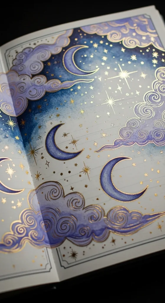 A dream journal page captures nighttime thoughts in a soft, creative way. Use dark blue or purple tones for a night-sky background. Draw tiny stars, moons, or clouds around the writing. Even short dream notes feel magical with this theme. The layout helps you remember dreams more clearly over time. Adding doodles makes the page feel whimsical. You can track recurring dream symbols this way. It turns your journal into a place for imagination as well as reflection.