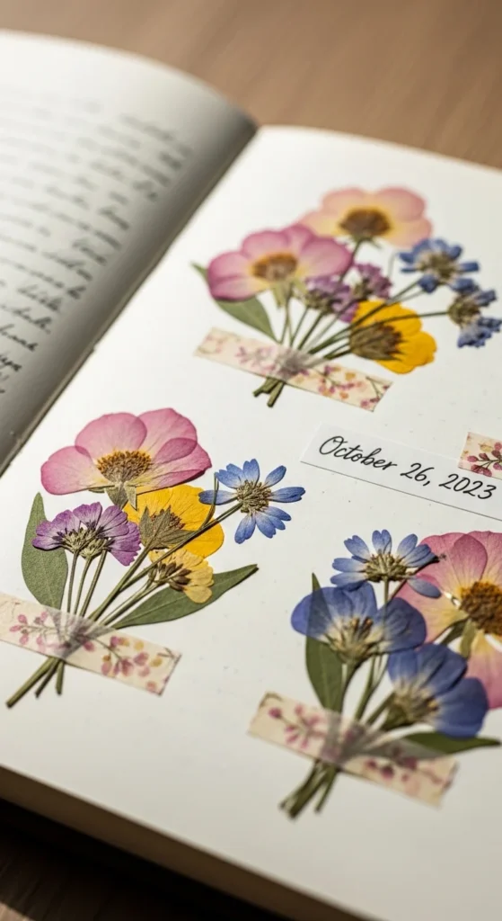 Pressed flowers bring real nature into your journal. Tape a dried flower or leaf gently onto the page. Write the date and where you found it. This turns the spread into a memory keepsake. The soft natural shapes pair beautifully with simple writing. Even tiny petals look lovely. It adds texture without much effort. Over time, these pages feel very special to look back on.