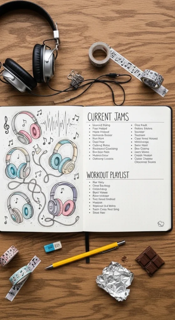 A playlist page mixes music and memory. List songs you’ve been loving lately. Draw tiny headphones, music notes, or stars around the titles. Use different colors for each song to add variety. Music often connects to emotions, so this page feels personal. Later, revisiting the list can bring back memories from that time. It’s like a soundtrack for your journal.