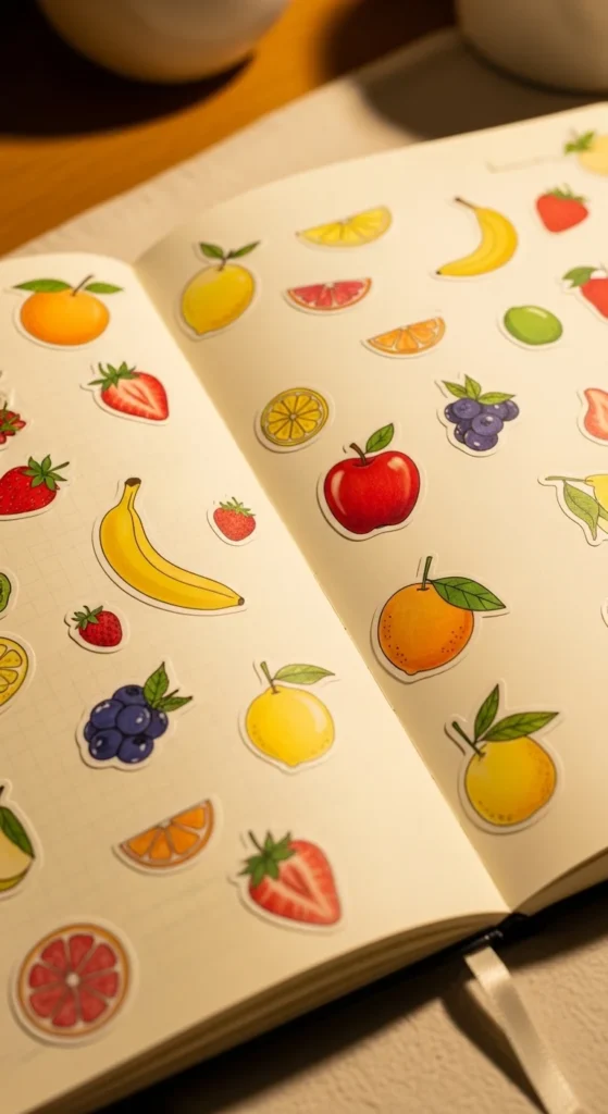 Fruit doodles bring cheerful energy to your journal. Lemons, strawberries, and cherries are easy to draw and look adorable. Bright reds, yellows, and pinks make the page feel lively. You can also cut fruit images from old magazines. This theme works well for summer memories or happy days. The playful shapes make the page feel lighthearted.