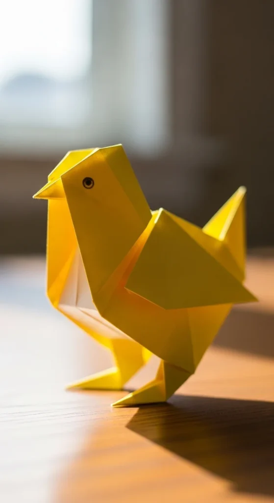 A paper chick is bright, cheerful, and easy to make. Fold a square into a triangle and then fold small tips on the sides to shape wings. Fold a tiny triangle at the front to create a beak. Draw eyes and a simple smile with a pen. Budget tip: Cut squares from yellow sticky notes for a quick project. These chicks are great for seasonal decorations or classroom crafts. You can glue them onto cards or place them on desks as small cheerful figures. The simple folds and drawn details make them fun for all ages.