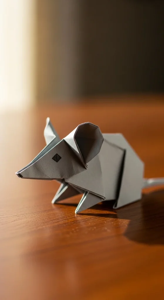 A mouse fold uses just a few sharp creases to form ears and a pointed nose. Fold a square into a triangle, then shape the top corners into round ears. Pull a small tip forward to create the snout. Draw whiskers and eyes with a pen. Budget tip: Use gray notebook paper or color white paper lightly with pencil. These little mice look cute on desks, shelves, or greeting cards. The simple shape makes it easy to make several quickly.