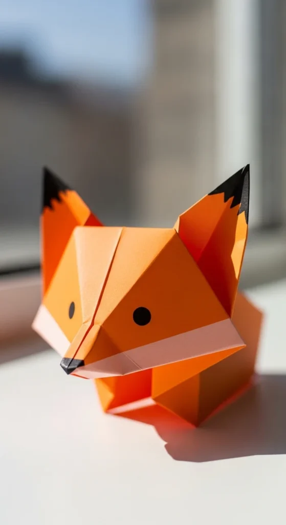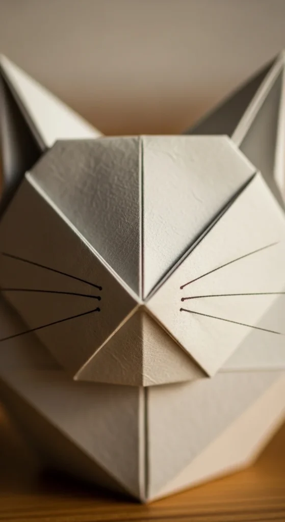 A cat face origami is a favorite for animal lovers. Fold a square diagonally into a triangle. Bring the two bottom corners upward to form pointed ears. Fold a small tip upward at the bottom for the chin. Draw whiskers, eyes, and a tiny nose. Budget tip: Use patterned or colored scrap paper to give each cat a unique look. These faces are great for bookmarks or small cards. Kids love adding different expressions with markers. The flat design makes them easy to glue onto notebooks or gift tags.