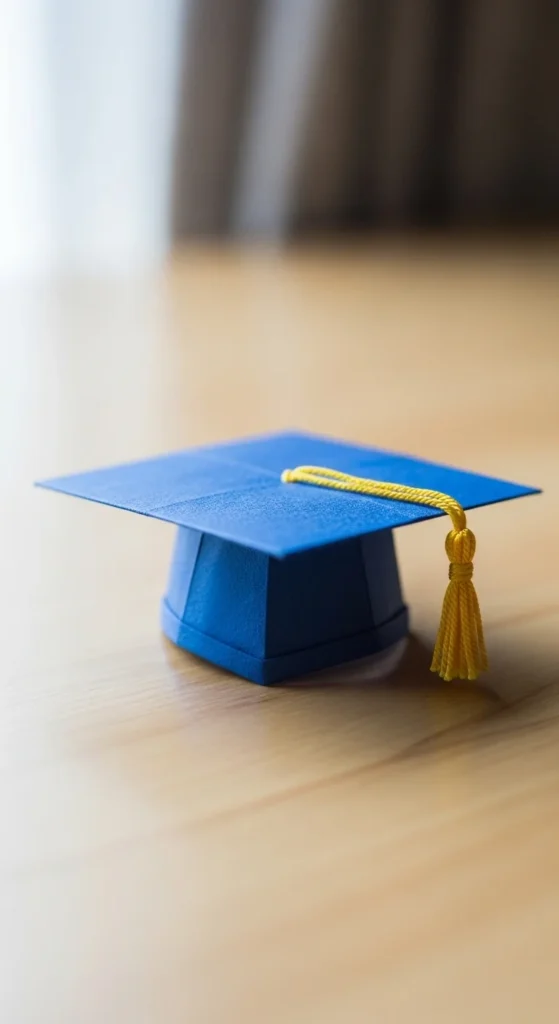 A graduation cap fold celebrates achievements in a cute way. Fold a square into a flat top shape and a small base. Add a drawn tassel detail with a pen. Budget tip: Use black paper from magazines. These caps make sweet decorations for graduation cards or party tables.
