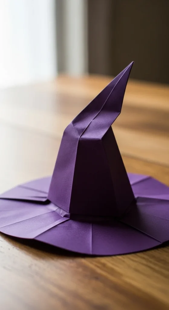 A witch hat fold is playful and seasonal. Shape a pointed cone top and flat brim using simple folds. Use dark paper for a spooky look. Budget tip: Cut squares from old wrapping paper. These hats are fun for Halloween decorations or themed crafts.