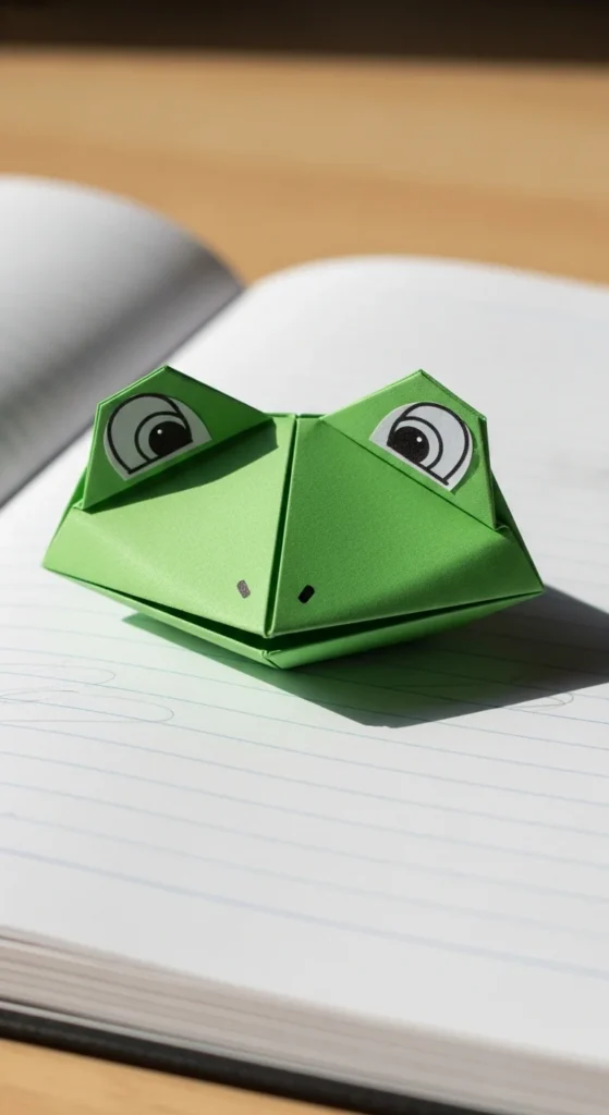 A frog face origami is playful and easy to recognize. Fold a square diagonally to make a triangle. Bring the bottom corners up slightly to create two eye bumps. Flip the model and fold a small tip upward for the mouth area. Draw big round eyes and a smiling mouth with a marker. Budget tip: Use green paper from scrap wrapping sheets or color plain paper with crayons. These frogs are fun for kids’ craft time or classroom decorations. You can glue them onto sticks to make simple puppets. The design is flat, so it’s easy to store or use in cards. Quick folds and drawn details make this a fast project with lots of personality.