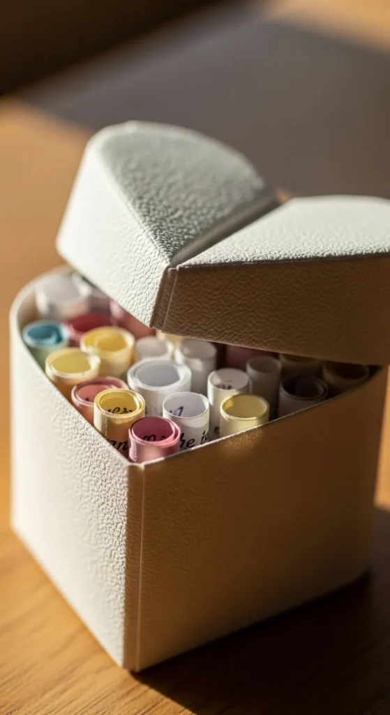 A heart box is both cute and practical. Fold a square into a shallow box base by shaping corners upward. Make a second folded piece shaped like a heart to use as the lid. Fit the lid gently over the base. Budget tip: Use slightly thicker paper like old greeting cards so the box holds its shape. These little boxes are perfect for tiny notes, candies, or rings. You can decorate the lid with a drawn bow or small sticker. Because the box is small and lightweight, it makes a lovely handmade surprise for birthdays or celebrations.