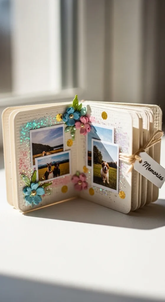 A mini wallet scrapbook is small, adorable, and easy to carry. Use one sheet of thick paper or cardstock and fold it into sections like an accordion. Each fold becomes a tiny page for a photo or short note. This format is perfect for best friend memories, pet photos, or favorite selfies. Decorate each panel with small stickers, washi tape strips, or doodled hearts. Because the space is small, you won’t feel pressure to over-decorate. Budget tip: Print photos in wallet size at home using regular paper, then glue them onto thicker scraps for stability. You can punch a hole in one corner and tie ribbon or string to keep it closed. This makes a sweet handmade gift too. The tiny size makes every detail feel extra special.
