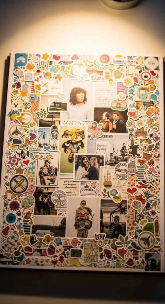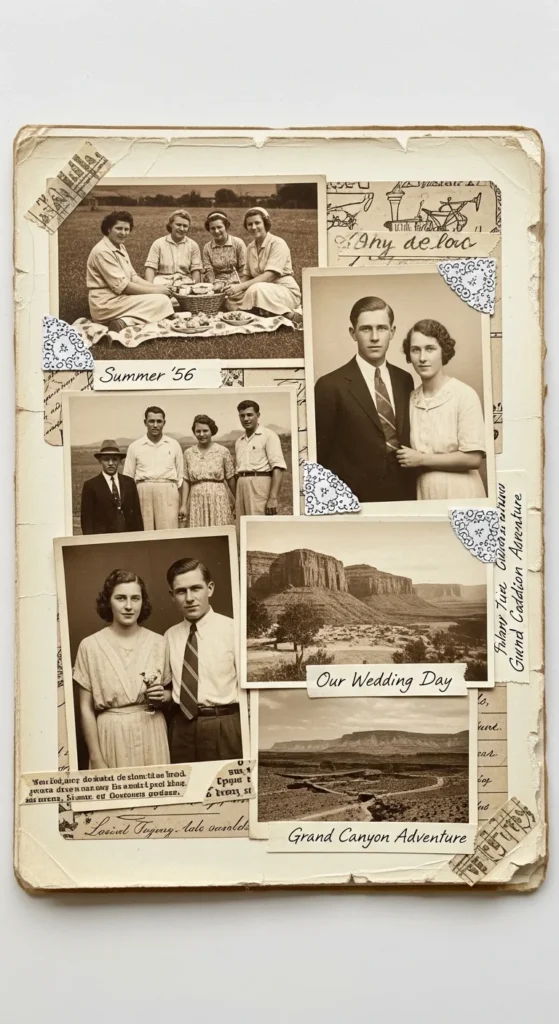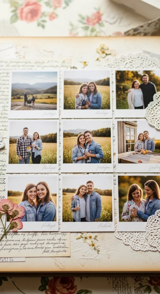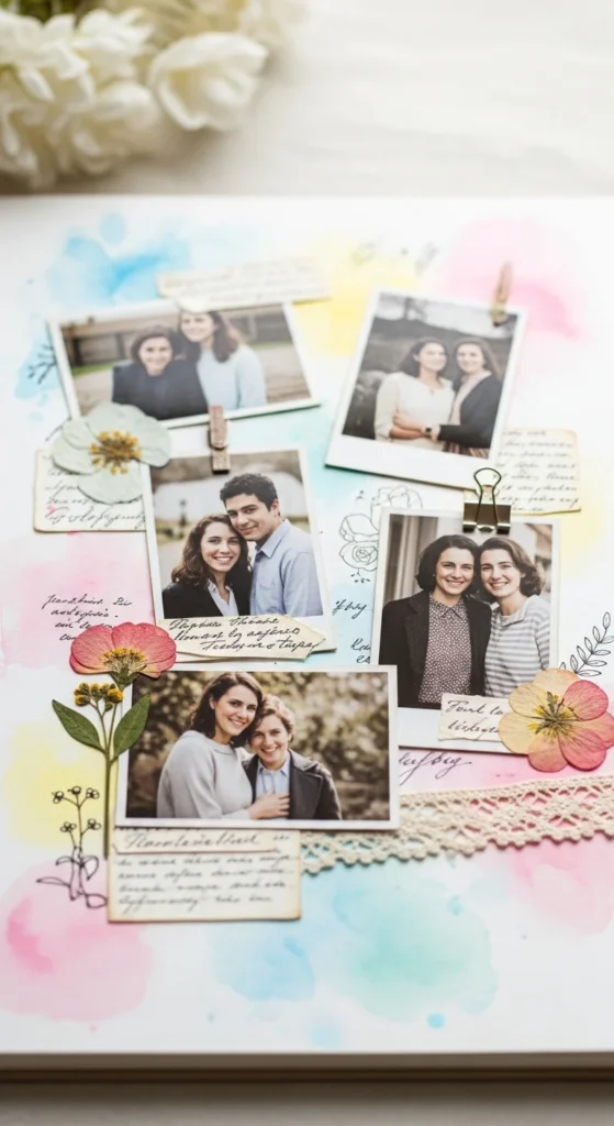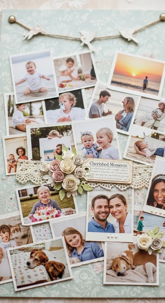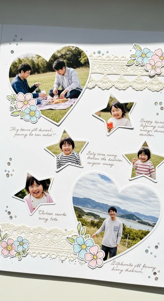 Cutting photos into shapes adds playful personality. Trim a favorite picture into a heart, circle, or star. Leave a thin border around the shape so important details don’t get cut off. Arrange shaped photos with regular rectangular ones for variety. Budget tip: Practice cutting shapes from scrap paper first. This idea works great for childhood photos or pet pictures where the mood is light and fun.