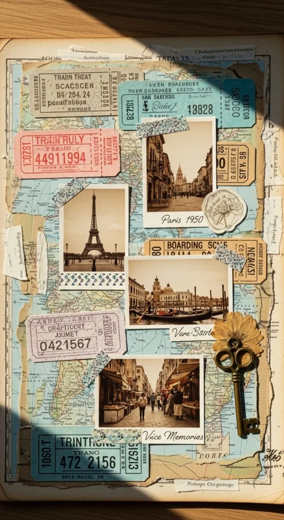 A travel map memory page tells the story of a trip in a simple, visual way. Cut a section from an old map or print one at home. Place it as the background. On top, glue small photos from your trip. Add ticket stubs, receipts, or tiny paper flags marking places you visited. Keep layers thin so the page still closes flat. Use short handwritten notes to describe one memory from each location. Budget tip: Print mini maps in black and white if you don’t have color ink. You can trace routes with a colored pencil to highlight the journey. This layout feels personal and full of story without needing fancy supplies.